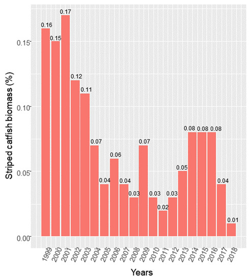 The proportional catch of the striped catfish among the total dai catches from all combined species in each fishing season is illustrated in Figure 4. Overall, we found that the relative catch of the striped catfish decreased gradually over the study period, e.g., decreased from 0.16% in the 1998/99 fishing season to only 0.01% in the 2017/18 fishing season.