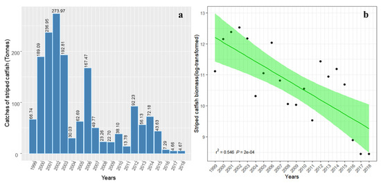 Barplot revealed the annual total catch of the striped catfish in the fishing season (Figure 5a). The catch of striped catfish declined significantly over the study period, e.g., 236.96 metric tonnes during the 2000–2001 fishing season to 4.67 metric tonnes during the 2017–2018 fishing season (Figure 5a). Moreover, we detected a significantly declining trend of the striped catfish catch in the Tonle Sap dai fishery from the 1998/99 to the 2017/18 fishing season (R2 = 0.54, coef = −4.64, p-value = 0.0002; Figure 5b).