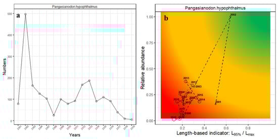 Time series: (a) number of individuals of the striped catfish randomly sampled from the Tonle Sap dai fishery and (b) relative abundance vs. length-based indicator of striped catfish species measured in random samples from the dai fishery in the Tonle Sap River, 2001–2019. The color scale indicates the reference direction from good (green) to poor (red) conditions.