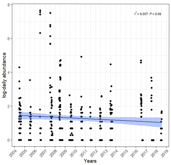 Figure 7 illustrates the temporal trend of the abundance of the striped catfish larvae/juveniles. Overall, we found that the abundance of larval and juvenile striped catfish in the Mekong River is also declining, with a marginally significant downward trend from 2004 to 2018 (Adj-R2 = 0.007, coefficients. = −1.75, p = 0.079).