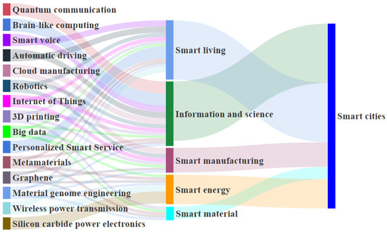 A Sankey diagram of 16 selected disruptive technologies (left) in seven key fields (middle) enabling smart cities (right). Thicker rectangles indicate greater frequency. The frequencies of 16 selected disruptive technologies are equal. The connecting nodes, inflows, and outflows indicate more connections with more and thicker nodes.