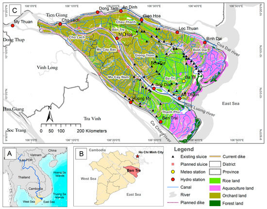 Vietnamese Mekong Delta (VMD) in Mekong River Basin (A), Ben Tre Province in the VMD (B), and hydro-meteorological stations, land use, and water infrastructure as sluice gates within the river network of Ben Tre Province (C).