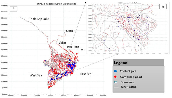 We used the SIWRP’s MIKE11 network for the whole VMD to update on details of primary and secondary canals and sluice gates within Ben Tre Province (Figure 3A,B). This model has been developed by Southern Institute for Water Resources Planning (SIWRP) since the 2000s, as its model network at the delta-wide level is applied to numerous projects, including water resources planning, flood forecast, and water quality projection [57,58,59].