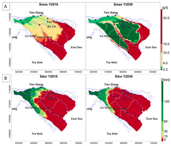 Maximum salinity intrusion (Smax) with the planned irrigation system in scenarios of Year 2016 and Year 2030 (A) and duration of salinity concentration (Sdur) exceeding 2 g/L in the existing irrigation system (B).