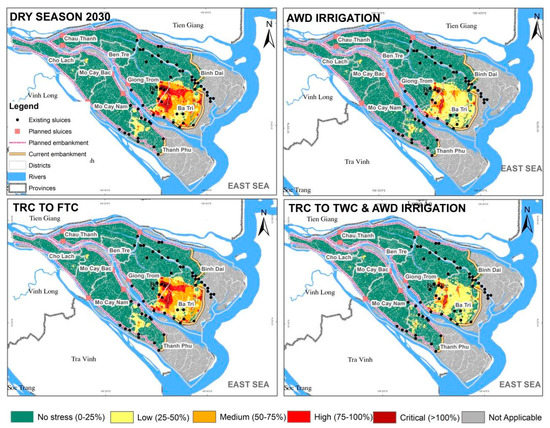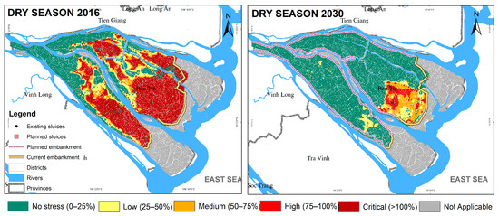 Figure 5 and Table 5 present the water stress status of the Year 2016 and Year 2030 scenarios during the dry season. Most of the freshwater areas are affected by medium water stress, while the water stress of medium to critical accounts for approximately 81,760 ha in 2016 (57.7% of the study area) and 16,220 ha (11.4%) in 2030. It means the planned irrigation system is unable to protect about 11.4% of the study area in 2030 under changing climate. Notably, the “No stress” area increased in the Year 2030 compared to the Year 2016 from the conversion of critical and high water stress, thanks to the effectiveness of the completed water infrastructures to reduce impacts of salinity intrusion driven by climate change (Figure 5). Therefore, additional measures are required to be incorporated into the planned solution to reduce water stress areas [2,11].