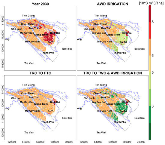 Water demand mapping for the three proposed measures was compared to the Year 2030 scenario (Figure 6). The triple rice paddy area in Ba Tri district is significantly reduced, which demands less than 3 thousand m3 in the TRC TO TWC&AWD IRRIGATION measure. These results demonstrate the effectiveness of management measures for the conversion from triple rice crop to wetting and drying irrigation methods for reducing agricultural water demand and ensuring sustainable water resources [8,9].