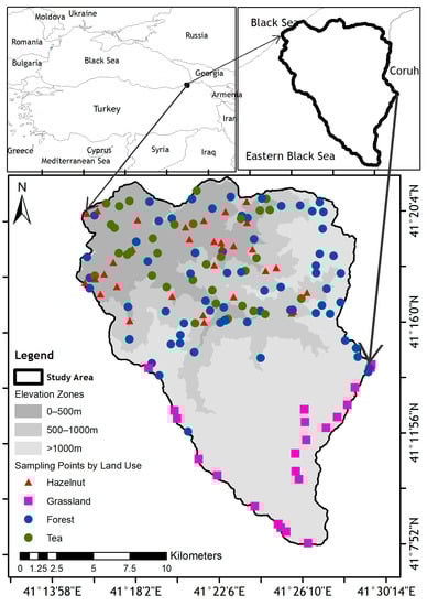 Changes in elevation affect soil organic matter by controlling plant species and biomass production in natural and cultural areas, soil-water balance, soil erosion, and geological deposition processes []. Tekeş and Cürebal [] reported that land use varies with elevation, with agriculture and settlement more common at lower elevations, while forest and grassland areas are more common at higher elevations. There have been few studies performed in the Eastern Black Sea region on changes in soil properties with land use, elevation, and soil depth [,,,,,,,,]. Thus, there are still gaps in the research in terms of how soil properties change in tea, hazelnut, forest, and grassland sites with elevation in this region of Turkiye. The knowledge that the present study will provide may help foresters and farmers in the region, especially, in the proper management and fertilization of their land.