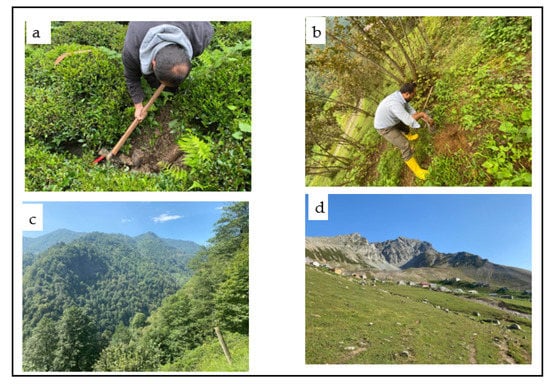 Some photographs of different land uses in the study area: (a) tea, (b) hazelnut, (c) forest, and (d) grassland.