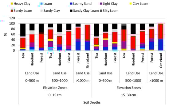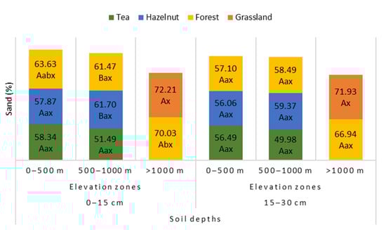 Variations in the mean sand content of the soils delineated by land use, elevation zone, and soil depth levels are given in Figure 4. The sand content of the soils at 0–15 cm depths differed significantly according to land use (p < 0.05). Pairwise comparisons demonstrated that the sand content at 0–15 cm soil depths in the 500–1000 m elevation zone was significantly lower (p < 0.05) in tea areas (51.49%) than in hazelnut (61.70%) and forest (61.47%) areas. The reason behind this could be that tea areas have less surface erosion compared to forest and hazelnut areas because terraces in tea areas decrease surface erosion. Similar results are found in studies performed in the region by Yüksek et al. [] and Karagül [] and in other parts of the world by Molla et al. [], Asmare et al. [], and Negasa et al. []. Karagül [] suggested that the differences in sand content with different land uses could be explained by the fact that changes in topography and elevation in the basin affect weathering, leaching, and profile development.
