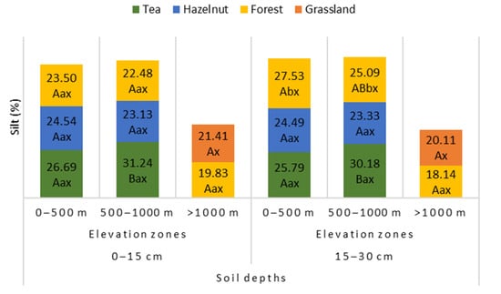 Variations in the average silt (%) content of the soils with land use, elevation zone, and soil depth levels are given in Figure 6. The silt content of the soils differed significantly with land use (p < 0.05). Similar results have been found by Mulugeta et al. []. Pairwise comparisons revealed that the silt content was significantly (p < 0.05) higher at 0–15 cm and 15–30 cm soil depths in tea areas (31.24% and 30.18%, respectively) than in hazelnut (23.13% and 23.33%, respectively) and forest (22.48% and 25.09%, respectively) areas in the 500–1000 m elevation zone.