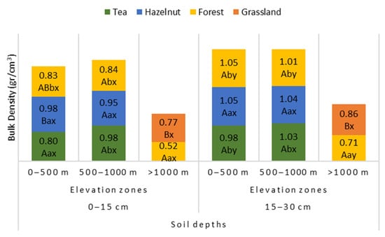 Variations in the average bulk density of soils with land use, elevation zone, and soil depth levels are given in Figure 7. The bulk density of the soils at 0–15 cm and 15–30 cm depths showed significant differences with land use (p < 0.05). According to the pairwise comparisons, the bulk density at 0–15 cm depths in the 0–500 m elevation zone was found to be significantly lower in tea areas (0.80 g/cm3) than in hazelnut areas (0.98 g/cm3) (p < 0.05), while the bulk density at 0–15 cm and 15–30 cm depths in the >1000 m elevation zone was found to be significantly lower in forest areas (0.52 g/cm3 and 0.71 g/cm3, respectively) than in grassland areas (0.77 g/cm3 and 0.86 g/cm3, respectively) (p < 0.05). The lower bulk density in forest and grassland areas compared to tea and hazelnut areas might be due to a higher organic matter content in the soils of these areas. The organic matter content of soil decreases with tillage and surface erosion in agricultural areas. The fact that the bulk density values of soil in grassland areas are higher than those in forest areas can be explained as a result of soil compaction due to intensive animal grazing in grassland areas. Shamsher et al. [] found that the bulk density of soil differed significantly with land use. They reported that bulk density in forest areas was significantly lower than in grassland and agricultural areas at all depth levels, and that bulk density decreased with increasing elevation and increased with increasing soil depth. Kebebew et al. [] reported that the bulk density of soil was significantly affected by type of land use. Tellen et al. [] determined that bulk density differed significantly with land use.