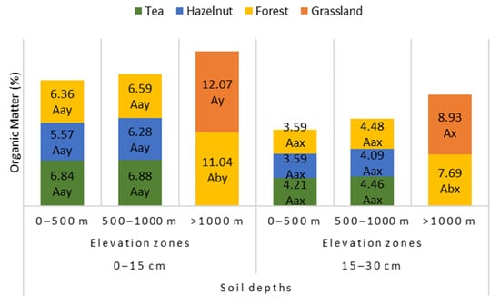 Variations in the average organic matter of soils with land use, elevation zone, and soil depth levels are given in Figure 8. The organic matter of soils at 0–15 cm and 15–30 cm depths showed significant differences with land use (p < 0.05). Further, the organic matter content of soils at 0–15 cm depths for all land uses in all elevation zones was found to be significantly higher than at 15–30 cm depths (p < 0.05). Shamsher et al. [] determined that the organic matter content of soil differed significantly according to land use, that organic matter content in forest areas was significantly higher than in grassland and agricultural areas at all depth levels, and that organic matter content increased with an increasing elevation and decreased with an increasing soil depth. Similarly, Tellen et al. [] and Khaldoon et al. [] determined that the organic carbon of soil differed significantly according to the land use. Tüfekçioğlu [] reported that the organic matter content of soils at the 0–30 cm depth level was greater in forest areas than in grassland areas.