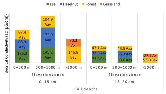 Variations in the average EC values of soils based on land use, elevation zone, and soil depth levels are given in Figure 10. The EC values of soils at 0–15 cm and 15–30 cm depths showed significant differences with land use (p < 0.05). According to Richards’ [] soil EC classification, the soils of the entire study area are in the non-saline electrical conductivity class. Moreover, the EC values of the soils at the 15–30 cm depth level were found to be significantly higher in tea areas (73.6 µS/cm) than in hazelnut (33.5) and forest (43.1) areas in the 0–500 m elevation zone. Kucuk and Yener [] found similar results in neighboring areas, as well. In a different study performed in Ethiopia, Tellen et al. [] determined that EC significantly differed with land use.