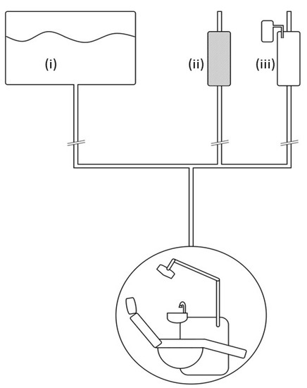 The guidelines on infection control in dental healthcare settings issued by the US Centers for Disease Control and Prevention [11] recommend that the level of the heterotrophic plate counts (HPCs) in dental unit water should not exceed 500 CFU/mL [71]. Moreover, the American Dental Association (ADA) has set a limit of ≤200 CFU/mL on the heterotrophic bacterial load in water from dental unit waterlines [72]. In the EU, however, there is no current guideline regarding a dental unit’s waterlines, though in some countries the drinking water standard is used as a reference (≤500 colony forming units (CFU)/mL of water heterotrophic bacteria) [63]. For this reason, dental units are designed to include (a) self-contained water systems (e.g., independent water tank) combined with chemical treatment (e.g., periodic or continuous chemical microbicide treatment protocols), (b) systems in parallel connection with one or more dental units within the same dental office that clean or treat incoming water to remove or inactivate microorganisms throughout the network and (c) combinations of these methods (Figure 1).