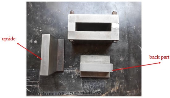 From the preparation of the 5 mixtures, specimens (CPs) were molded in a rectangular shape (Figure 3) using a press with a pressure of 35 MPa and dimensions of approximately 115 × 25 × 12 mm via the pressing process. Thus, 275 CPs were made, 13 for each composition. The CPs were subjected to 4 different sintering (burning) temperatures, namely 750, 850, 950, and 1050 °C.