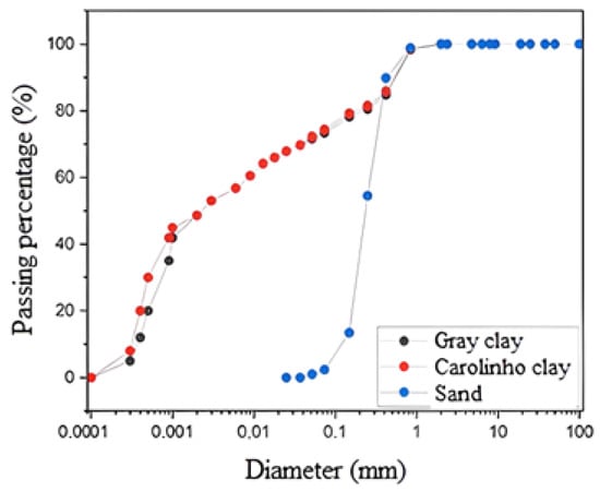 Figure 5 illustrates the granulometry of the raw materials (carolinho and gray clays—ball clay and sand) used in the ceramic mass preparation.