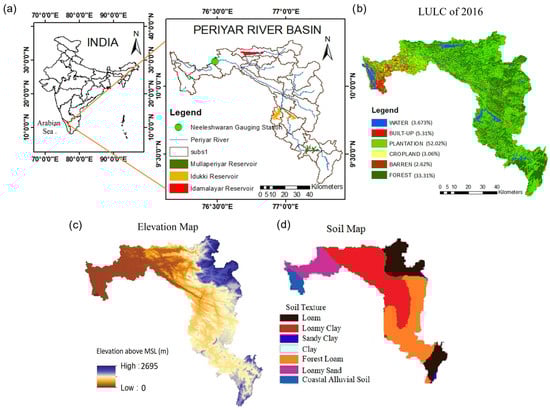 (a) Periyar river basin and sub-basins, (b) LULC (2016), (c) elevation map, and (d) soil texture of Periyar river basin.