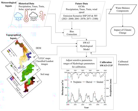 Hydrological models are notably useful for determining the regional hydrologic implications of changes in temperature, precipitation, and other climatic factors. Hydrologic models are mainly classified as empirical models, conceptual models, and physically based models. Due to the inclusion of parameters with physical interpretations, physically based hydrological models are preferred over other model types for assessing the effects of climate change [11]. Another advantage is that they can be used in many scenarios and provide a lot of information about the role of the parameters involved. Water balance models are particularly appealing for water resource studies of climatic changes due to their ability to incorporate monthly or seasonal variations in climate, snowfall and snowmelt algorithms, soil moisture, groundwater, and natural climatic variability [12]. With proper calibration and validation, these models can replicate near-true conditions. The Soil and Water Assessment Tool (SWAT) is one such physically based hydrological model that has been identified to accurately predict annual and monthly streamflow in a variety of environmental conditions [13,14]. These findings make the model a useful instrument for hydrological estimates of water attributes on a watershed scale.