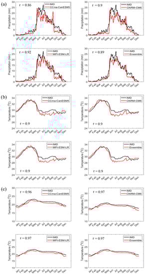Comparison of climatology of GCMs and their ensemble average, with respect to observed climatology (IMD) from 1989–2019, for daily: (a) rainfall, (b) maximum temperature, and (c) minimum temperature. The correlation coefficient (r) value is mentioned in the corner of each figure.