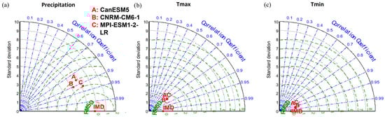 Taylor diagram comparing performance of each GCM with respect to the observed data for the historical period (1989–2019): (a) rainfall (mm), (b) maximum temperature (Tmax) (°C), and (c) minimum temperature (Tmin) (°C).