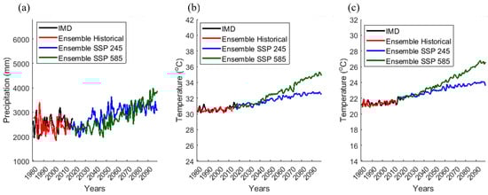 Historical (1980–2020) and future (2021–2100) time series of GCM ensemble for the average annual (a) precipitation (mm), (b) Tmax (°C), and (c) Tmin (°C), along with IMD (observed: 1980–2020) values to observe trend.