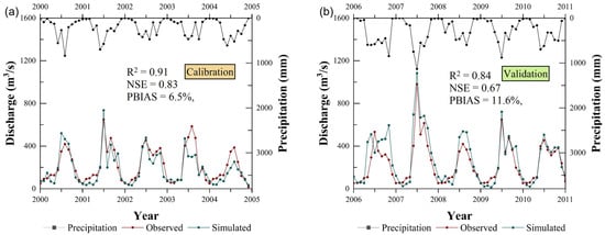 Observed and simulated discharge for (a) calibration (2000–2004) and (b) validation (2006–2010) periods at Neeleshwaram gauging station for the PRB.