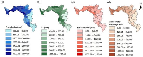 Average annual (a) precipitation (mm), (b) evapotranspiration (mm), (c) surface runoff, and (d) groundwater discharge (mm) for the historical period (1989–2019) in the PRB.
