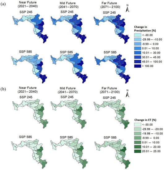 Spatial change in average annual (a) precipitation (%) and (b) evapotranspiration (%) for near (2021–2040), mid (2041–2070), and far (2071–2100) future under SSP 245 and SSP 585 scenarios in the PRB.
