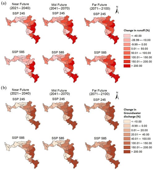 Spatial change in average annual (a) surface runoff (%) and (b) groundwater discharge (%) for near (2021–2040), mid (2041–2070), and far (2071–2100) future under SSP 245 and SSP 585 scenarios in the PRB.