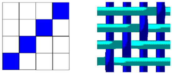 For this study, bio-based materials from natural flax fibers were compared with synthetic material from glass fibers. The manufacturing process resulted in a bio-based composite material obtained from a mixture of fibers (20% flax), with a matrix of 80% resin, and a synthetic material obtained from 21% glass fiber, with a matrix of 79% resin. The orientation of the fibers was a determining factor for the composites’ properties [28,35,39]. Based on the orientation of the fibers, there were two groups of semi-products: a unidirectional composite bio-based material and a twill composite bio-based material. A material is said to be unidirectional when its intertwined fibers are oriented in single direction. A material is called twill when its base fixture is made of uneven and oblique threads relative to the edges, as illustrated in Figure 1. This oblique effect was obtained by removing a thread from each line of fabric [41,42].