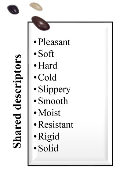 To be effective, a descriptor must meet three basic requirements: relevance, precision, and differentiation, and to a lesser extent, it has to be exhaustive and independent [4,5,6,9,10,11,12]. This study began with a list of 10 descriptors from the literature [50,51,52]. This list is presented in Figure 2. Based on this list of descriptors, this study focused on consumers’ sensations.