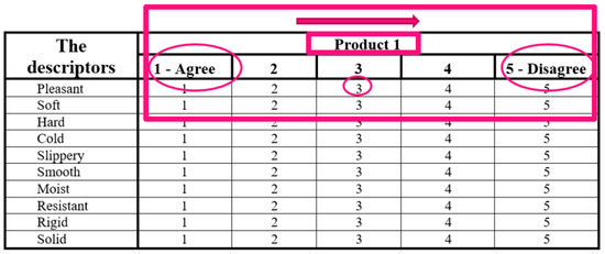 The list of established descriptors was presented in the form of a Likert scale, as shown in Figure 5. This scale was ordinal, and the possible answers to questions were arranged hierarchically [5,13,21,52]. The different product categories (twill bio-based material, unidirectional bio-based material, and synthetic fiberglass material) were not disclosed in order to ensure consistency. Therefore, the semantics regarding the product categories did not influence the ranking that the subjects chose [53,54]. Using the test sheet presented in Figure 5, for each descriptor, a subject had to indicate their degree of preference according to the grid from 1 to 5, thus assessing their perceived sensation when touching a product. A rating of 1 meant that the descriptor was in perfect agreement with their sensation when touching the product, and 5 meant that the descriptor was in complete disagreement with their sensation when touching the product.