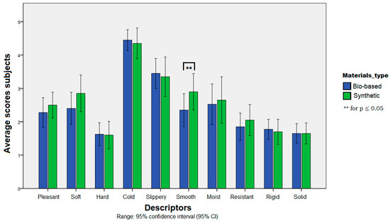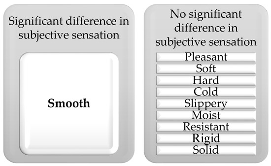 It became obvious that for descriptors such as “Pleasant,” “Soft,” “Hard,” “Cold,” “Slippery,” “Moist,” “Resistant,” “Rigid,” and “Solid,” there were no differences in the subjective sensations induced by touching the different types of materials, whether they were the bio-based or synthetic materials. Only the results related to the “Smooth” descriptor indicated that the subjective sensations were different. This specific result is indicated in red in Table 2.