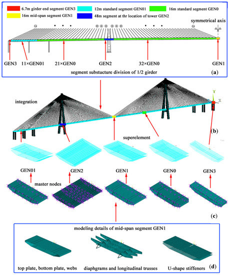 - A multi-scale FE model, which can effectively reduce the calculation time based on the substructure method, has been established to analyze the temperature-induced stress of U-ribs on long-span bridges. The accuracy of the multi-scale FE model results for the temperature-induced stress of U-ribs has been confirmed through monitoring data.