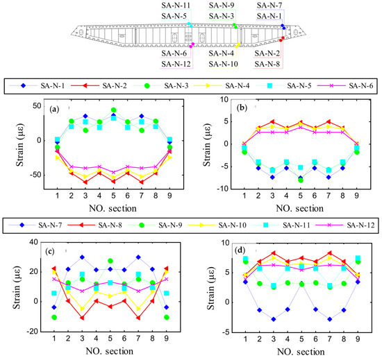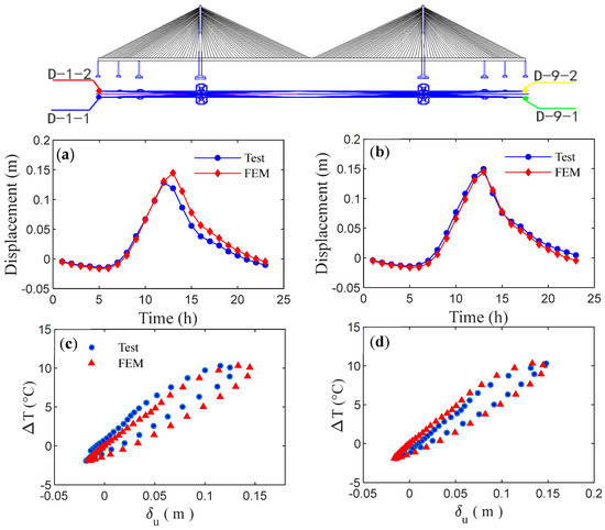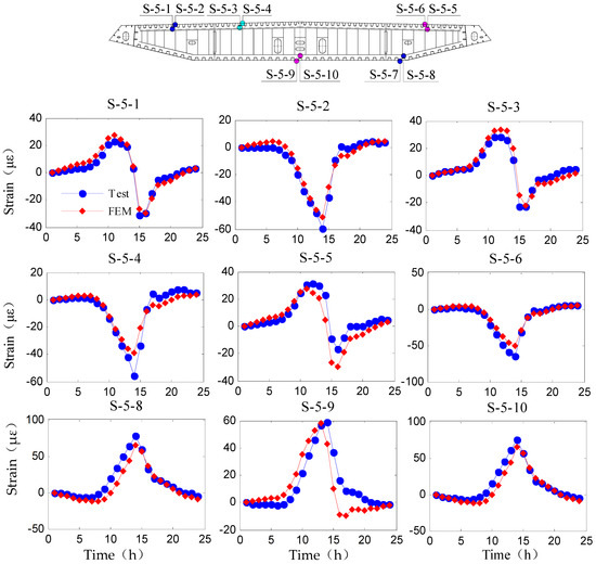 - By evaluating the temperature-induced strain during the highest and lowest temperatures of one day on the multi-scale FE model, it indicates that the deflection of the girder, a key index for bridge design and SHM assessment, exhibits dynamic changes in response to temperature loads. The temperature-induced strain of the top and bottom plates displays a maximum variation range of approximately 100 .