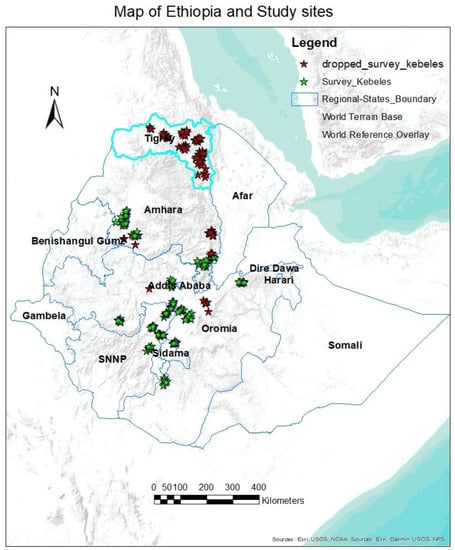 Map of Ethiopia and study survey sites. Compiled by the Author, 2023. Red shows the study sites excluded from the 2021 survey due to security issues in Tigray and Amhara regional states as well as ELAP-supported woredas excluded to avoid selection bias. Source: USAID [26], [Data set]. https://www.land-links.org/ accessed on 21 December 2022.