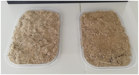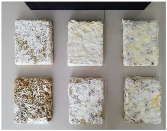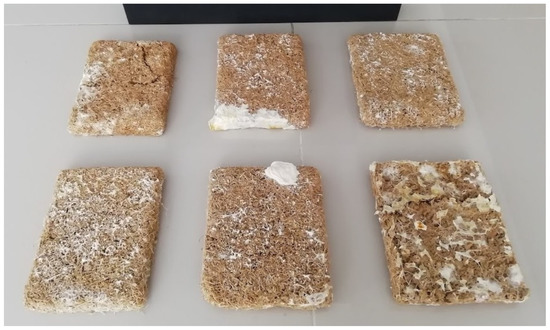 Figure 1, Figure 2 and Figure 3 show the biomaterials obtained from the different dosages and the necessary conditions for their development, such as darkness, temperature (26 °C), and substrate humidity (85–87%) during the 29 days of growth. The colonization of the mycelium gave a whitish appearance with some yellowish and brown tones. This is due to the increase in temperature in the final stage for the inhibition of the fungus. By standardizing the particle size of the substrate, its efficiency for the development and growth of the mycelium increased. This result was obtained as a consequence of increased oxygen exchange and increased moisture retention. In addition, it presented a soft and cottony texture typical of the mycelium formed on the surface, also called “fungal skin,” which developed irregularly; significant differences were observed since different treatments were elaborated, obtaining, as a result, a total of eighteen inoculated samples and only one presented contamination by mold on day 14 of sowing inside the substrate.
