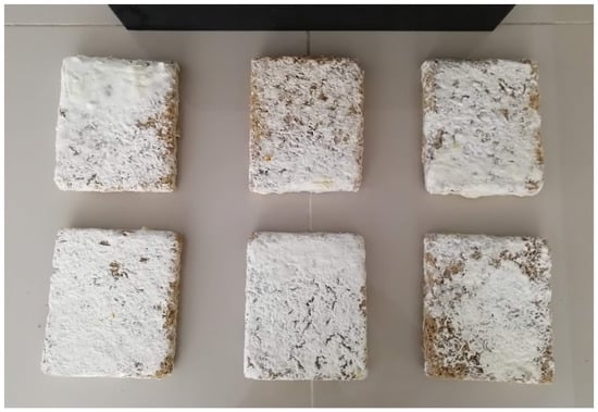 The substrate was added to previously weighed mycelium and was manually shaken for 1 min for uniform growth. The mixed product was placed in sterile 1 L beakers and incubated at 26 °C for 10 days. During this period, the mixtures were hydrated with 5–10 mL of sterile distilled water and homogenized every 3 days, obtaining the biomaterial [30]. The biomaterial (M1, M2, and M3) was prepared with three inoculum concentrations, where blocks M1 consisted of 340 g of bagasse + 60 g of inoculum (15%), M2 had 80 g of bagasse + 320 g of inoculum (20%), and finally, M3 contained 300 g of bagasse + 100 g of inoculum (25%). To make the biomaterial-based blocks, 20 × 15 × 3 cm wooden molds containing a combination of bagasse and the Pleurotus ostreatus inoculum were employed. It was evenly distributed and then incubated at 26 °C for 14 days under aseptic conditions. The mixtures were hydrated with 3–5 mL of sterile distilled water. After 14 days, the wooden molds were removed, and the biomaterial-based blocks were obtained, which were left to incubate for 5 days at 26 °C. Subsequently, this biomaterial was placed in an oven at 60 °C for 24 h. Finally, the blocks were allowed to cool to store them in first-use bags for later analysis of density, texture, and moisture absorption.