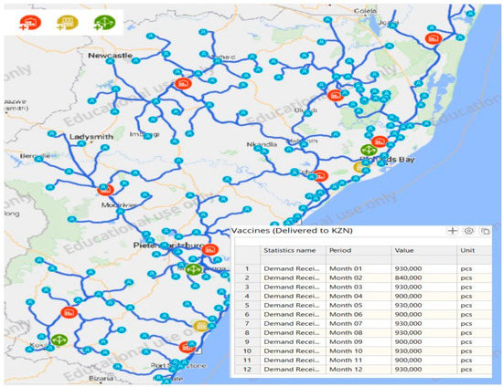 Figure 1 depicts a visual simulation of vaccination sites in KwaZulu-Natal Province in South Africa (blue), distribution centres (red), suppliers (green), provincial warehouses (brown) and the road network. The figure presents the projected figures for vaccines delivered per month, calculated based on the province’s population (11.5 million).