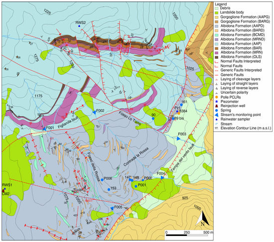 Geological map and monitored springs/streams (see location in Figure 1) (modified by Rizzo et al. [21]).