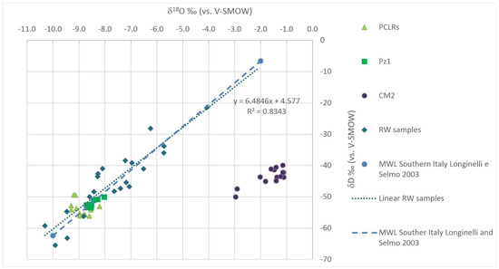 O versus δ2H relationship in water samples collected from rainwater samplers at PCLRs, at the Pz1, and the oily wastewaters before the reinjection. Linear RW is the local meteoric water line obtained by local rainwater. MWL is the Meteoric Water Line of Southern Italy obtained from Longinelli and Selmo [44].