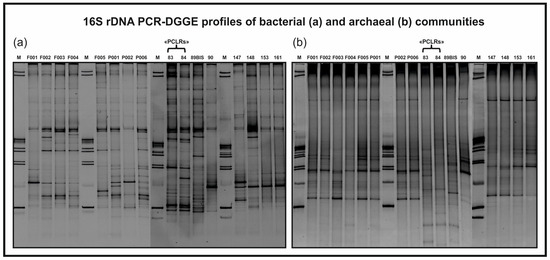 Bacterial (a) and archaeal (b) 16S rDNA PCR-DGGE community profiles of PCLRs (sample codes 83 and 84) before being tampered with (April 2016), other springs (sample codes P001, P002, P006, 89BIS, 90, 147, 148, 153, and 161), and stream monitoring points (sample codes F001, F002, F003, F004, and F005).