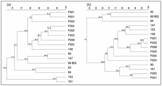 Cluster analysis of bacterial (a) and archaeal (b) 16S rDNA PCR-DGGE profiles of PCLRs (sample codes 83 and 84) before being tampered with (April 2016), other springs (sample codes P001, P002, P006, 89BIS, 90, 147, 148, 153, and 161), and stream monitoring points (sample codes F001, F002, F003, F004, and F005) (Dice coefficient with the UPGMA clustering algorithm). Similarity values are shown.