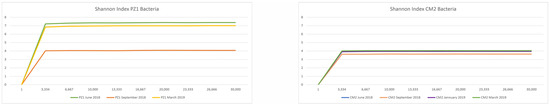 The rarefaction analysis, a measure used to estimate the alpha diversity in samples and gauge whether or not sequencing efforts captured the microbial diversity, revealed Shannon index values ranging from 3.6 and 4.0 for the CM2 samples. For the Pz1 samples, lower biodiversity was recorded in September 2018 (Shannon index value of 4.0) compared to June 2018 and March 2019 (Shannon index values of 7.3 and 7.0, respectively) (Figure 6).