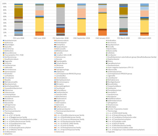 The results of the characterization of microbial communities of the springs through Next-Generation Sequencing have already been reported by Rizzo et al. [21]; accordingly, only the data relating to CM2 and PZ1, used as a representative of the groundwater formerly feeding the PCLRs, are discussed here. The final read numbers of the sequences obtained for each sample are shown in Table 3. Unfortunately, the PZ1 sample taken in January 2019 was damaged during transport and could not be analyzed in the laboratory.