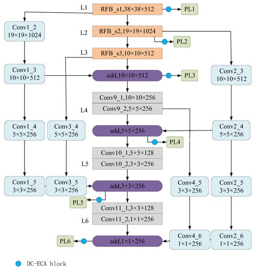 PL1 and PL2 are derived from L1 and L2, respectively, because their feature maps are relatively large. As the network goes deeper, the details on small defects become less visible, which is not conducive to the detection of small defects. Therefore, new prediction layers PL(i) are generated to replace the original L(i; i = 3, 4, 5, 6) for prediction.