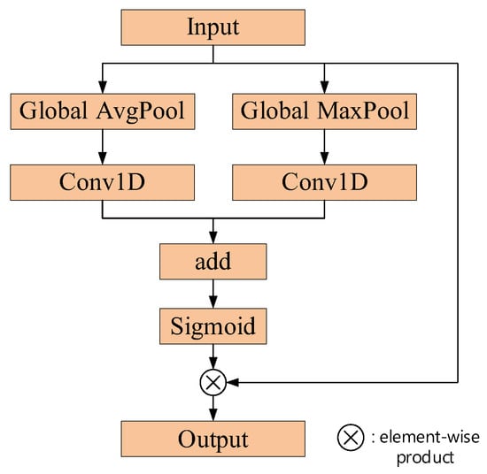We propose a dual-channel Efficient Channel Attention block (DC-ECA Block) based on the ECA module, as shown in Figure 5. The difference between the DC-ECA Block and the ECA module lies in the pooling layer part. The DC-ECA Block simultaneously uses global maximum pooling and global average pooling. The maximum pooling can better preserve the local features of the drainage pipeline, while the average pooling can better preserve the overall features of the pipeline. Therefore, the parallel connection of the two different pooling methods can obtain richer channel features. The input H×W×C features are separately compressed by global max pooling and global average pooling to obtain two 1 × 1 × C feature maps. Then, channel feature learning is performed through 1 × 1 convolution. Finally, the two weight vectors obtained are added, and the final channel weight vector is obtained through the Sigmoid activation function.