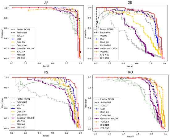 Figure 6 displays the P-R curves of different methods on various types of sewer defects. It can be observed that the proposed method in this paper performs significantly better than other methods in detecting the deformation and displacement of sewer pipes. It also exhibits good performance in detecting settled deposits and root intrusion.