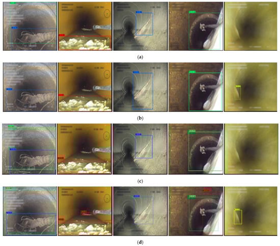 To demonstrate the effectiveness of our method in detecting defects in underground drainage pipes, we compared the detection results of the top four models with the best performance, as shown in Table 2. We randomly selected drainage pipe images containing different types of defects and evaluated their detection performance, as depicted in Figure 7. In Figure 7e, the manually defined positions and extents of the defects are displayed, while the other rows show the detection boxes predicted by different detection models (different types of defects are color-coded, with green representing Displaced joints, red representing Settled deposits, blue representing Roots, and yellow representing Deformations). By comparing the prediction results of the different models, it is evident that our model’s predictions were closest to the ground truth labels. Our model exhibited superior detection performance compared to other detection models—effectively identifying both scattered Displaced joints and subtle pipe deformations that are challenging to recognize.