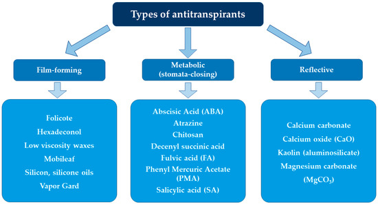 Antitranspirants (AT) are products that reduce transpiration from the above-ground parts of the plants. The basic division of AT comprises three groups: film-forming, metabolic (stomata-closing), and reflective type (Figure 1). The first group includes film-forming antitranspirants. After their application to the plant, a physical barrier (film) is formed over the stomata, thus reducing transpirational water loss. This group mainly includes water-emulsifiable organic polymers, latex, plastics, or wax emulsions [12]. A popular commercial formulation in this group is Vapor Gard® (Bio Agris brand)—a water-emulsifiable organic concentrate composed of di-1-p-menthene (C20H34). This terpene polymer also functions under the name of pinolene, which is produced from conifer resins during distillation [13]. The second group is metabolic AT, otherwise known as stomata-closing preparations. Applying this type of AT causes partial stomatal closure, which results in lower transpiration. This group includes substances with hormonal and hormone-like effects [14]. The most common metabolic AT include chitosan, fulvic acid, and abscisic acid (ABA). The last group of antitranspirants is the reflective type, which contributes to increased reflectance and a concomitant reduction in leaf temperature and transpiration rate [14,15,16]. One of the most popular AT in this group is aluminum phyllosilicate Al2Si2O5(OH)4—also known as kaolin [17]. According to a literature review by Mphande et al. [14], kaolin was the most studied reflective antitranspirant on arable crops from 2009 to 2018. Other preparations included in this group are calcium carbonate (CaCO3) and calcium oxide (CaO), which have similar properties.